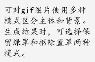 本程序能够对gif动图抠除背景。点击保留物体和点击抠背景模式都是取当前帧点击处颜色,依据此颜色对所选多帧点击处所在的闭合 区域进行同色保留或抠除(判断同色的阙值可自行指定)。点击保留同色区域和点击抠除同色区域模式也同样是取各帧点击处颜色,对所选多帧进行同色 保留或抠除,与前者区别在于前者是对点击处通过泛洪法获得的闭合同色区域进行操作(不会影响不连通的其他同色区域),而后者是对所有颜色相同区域进行操作。剩下的两种手动涂抹模式 作为前面针对颜色操作的补充。生成图片时可以选择抠除蓝罩部分和保留绿罩部分两种方式(看背景和主体选择哪个更方便)。